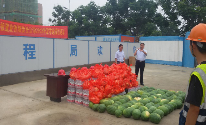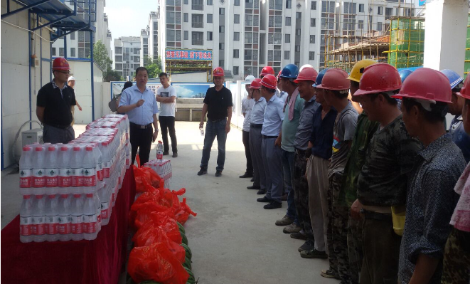 在各項(xiàng)目施工現(xiàn)場,帶隊(duì)領(lǐng)導(dǎo)、公司副總經(jīng)理丁昌華首先對(duì)在高溫下堅(jiān)持工作的一線職工表示親切慰問,叮囑大家在完成工作任務(wù)的同時(shí),要注意自身的身體健康和生產(chǎn)安全。他要求,各地塊施工單位要進(jìn)一步加強(qiáng)高溫季節(jié)職工勞動(dòng)保護(hù)和防暑降溫工作,要加強(qiáng)對(duì)高溫、高濕、高空、露天作業(yè)場所的監(jiān)督檢查,督促各參建單位嚴(yán)格執(zhí)行高溫作業(yè)的有關(guān)規(guī)定,調(diào)整好作業(yè)時(shí)間,確保高溫期間一線職工的生產(chǎn)安全和生活健康。為切實(shí)解決工地高溫作業(yè)困難,公司還在各項(xiàng)目現(xiàn)場發(fā)放了“夏日送清涼”的慰問品。