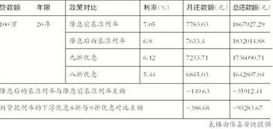 以20年期限的100萬元放貸計(jì)算,按照每月均等的還款方法,此次降息前利率為7.05%,月均還款7783元,支付利息總額86.7927萬元;而按照降息25個(gè)基點(diǎn)之后利率為6.8%,月均還款7633.4元,下降了接近150元,利息總額83.2萬元,減少了3.6萬元。