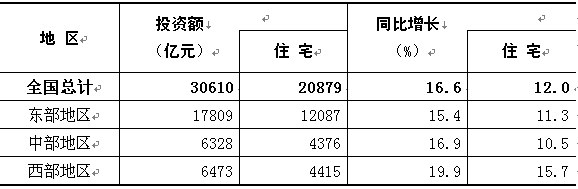 1-6月份,東部地區(qū)房地產(chǎn)開發(fā)投資17809億元,同比增長15.4%,增速比1-5月份回落0.6個百分點;中部地區(qū)房地產(chǎn)開發(fā)投資6328億元,增長16.9%,增速回落5.4個百分點;西部地區(qū)房地產(chǎn)開 發(fā)投資6473億元,增長19.9%,增速回落2.6個百分點。