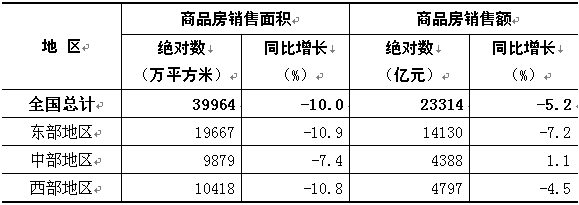 1-6月份,東部地區(qū)商品房銷售面積19667萬平方米,同比下降10.9%,降幅比1-5月份縮小3.2個百分點;銷售額14130億元,下降7.2%,降幅縮小4.9個百分點。中部地區(qū)商品房銷售面積9879萬平方米,下降7.4%,降幅縮小2.8個百分點;銷售額4388億元,增長1.1%,1-5月份為下降2.9%。西部地區(qū)商品房銷售面積10418萬平方米,下降10.8%,降幅縮小0.3個百分點;銷售額4797億元,下降4.5%,降幅縮小0.5個百分點。