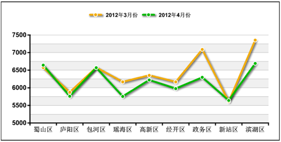 區(qū)屬2012年3月份2012年4月份漲跌情況蜀山區(qū)6577.116644.491.02%廬陽區(qū)5874.145760.78-1.93%包河區(qū)6576.496571.59-0.07%瑤海區(qū)6168.835755.51-6.70%高新區(qū)6354.436222.11-2.08%經(jīng)開區(qū)6167.985977.99-3.08%政務(wù)區(qū)7090.166297.89-11.17%新站區(qū)5611.565641.470.53%濱湖區(qū)7355.616692.74-9.01%全市6337.376219.40-1.86% 2012年4月份合肥住宅區(qū)屬銷售均價(jià)及環(huán)比變化情況一覽表