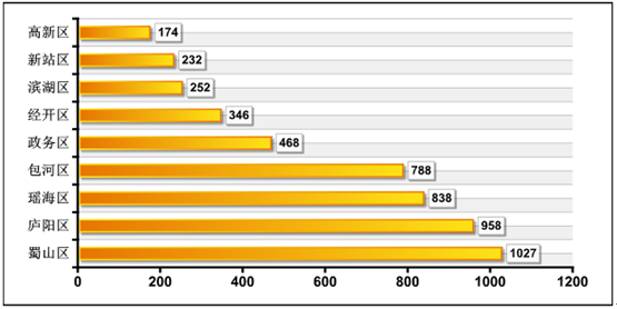 2012年4月份的片區(qū)中,蜀山區(qū)以1027套的銷售業(yè)績排9區(qū)銷售之首,占到了全市銷售比例的20%;廬陽區(qū)以958套的銷售量排名第二,占到了全市銷售比例的19%;排名第三的瑤海區(qū)的銷售量為838套,其占全市比例為16%;包河區(qū)的銷售為788套,排名第四,其占全市比例為16%;政務(wù)區(qū)的銷售為468套,其占全市比例為9%;經(jīng)開區(qū)的銷售為346套,其占全市比例為7%;濱湖區(qū)的銷售為252套,其占全市比例為5%;新站區(qū)的銷售為232套,其占全市比例為5%;高新區(qū)的銷售為174套,占全市比例為3%。