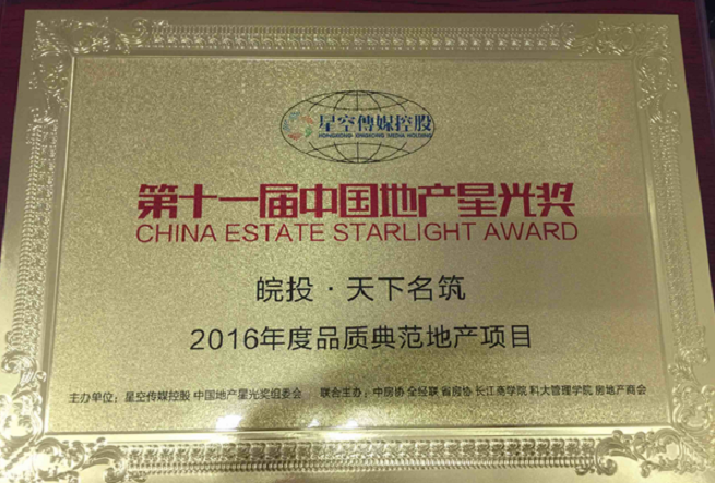 2016年12月28日下午,第十一屆中國(guó)地產(chǎn)星光獎(jiǎng)?lì)C獎(jiǎng)典禮在合肥香格里拉大酒店盛大舉行,在歷經(jīng)千萬(wàn)網(wǎng)友的投票評(píng)選以及省房協(xié)、星空地產(chǎn)研究院等組成的專(zhuān)家評(píng)審團(tuán)審定后,皖投安慶天下名筑脫穎而出,榮獲“2016年度品質(zhì)典范地產(chǎn)項(xiàng)目”。