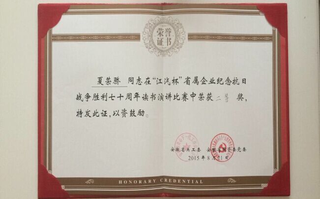 2015年8月21日,由省關(guān)工委、省國資委黨委、省國資委關(guān)工委聯(lián)合舉辦的大型演講比賽在江汽集團(tuán)研發(fā)中心隆重舉行,三十余家省國資企業(yè)參賽,經(jīng)過激烈角逐,代表我司及集團(tuán)公司參賽的夏榮驕同志以一篇《回憶里選擇未來》打動了評委及現(xiàn)場觀眾,獲得評委高度贊揚(yáng)并榮獲二等獎,充分展示了國企員工的風(fēng)采,為集團(tuán)公司和我司爭得了榮譽(yù)。